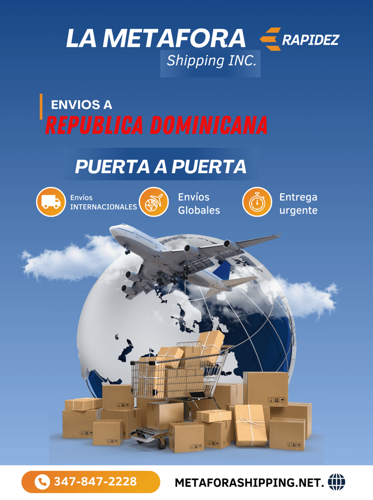 ¡Atención a todos los residentes de la República Dominicana! ¿Necesitas enviar un paquete a cualquier parte del la República Dominicana de manera rápida y confiable? ¡No busques más! La Metáfora Shipping Inc. es la solución perfecta para tus necesidades de envío. Ofrecemos un servicio puerta a puerta desde estados unidos a cualquier parte del la República Dominicana Con nuestra amplia red de transporte y nuestro equipo altamente capacitado, puedes estar seguro de que tu paquete llegará a salvo y a tiempo. ¡Haz tu envío con la Metáfora Shipping Inc. y experimenta la facilidad y la eficiencia en el proceso de envío! ¡Contáctanos hoy mismo y obtén una cotización personalizada para tu envío a República Dominicana!🇩🇴